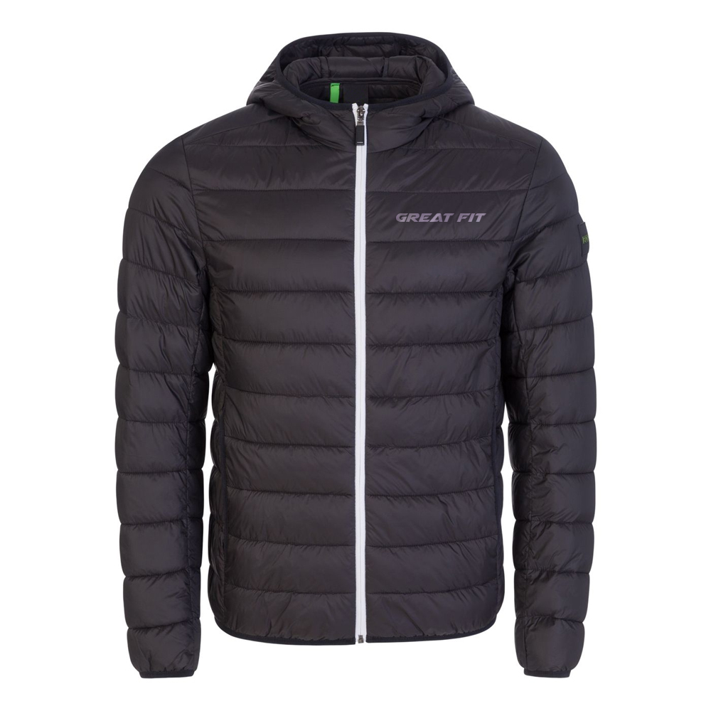 his puffer jacket designed by Greatfit Sports, which features a sleek black/grey colourway along with a front zip closure and open pockets, with additional zip pockets on the inside. The jacket is ideal for any occasion.