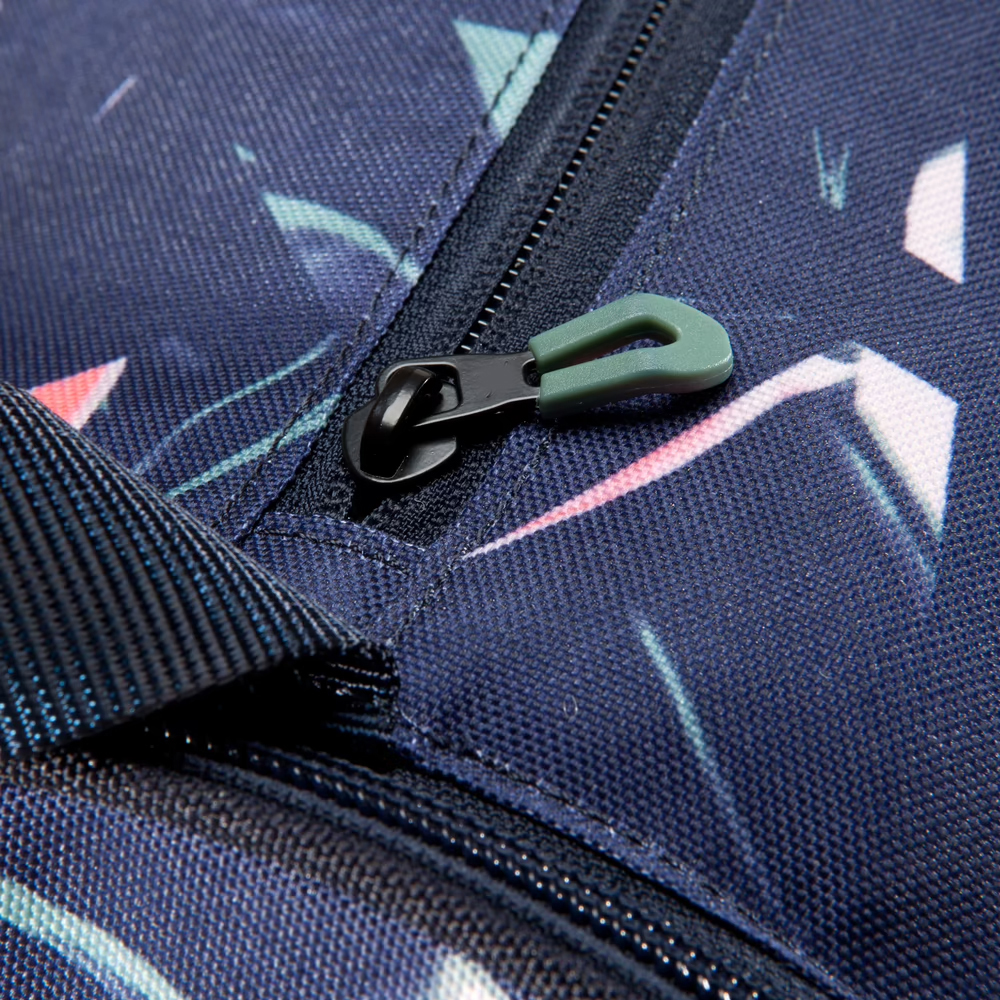 The user has six zippered pockets, three external and three inner, mesh ones. Flap has a velcro panel for personalization.